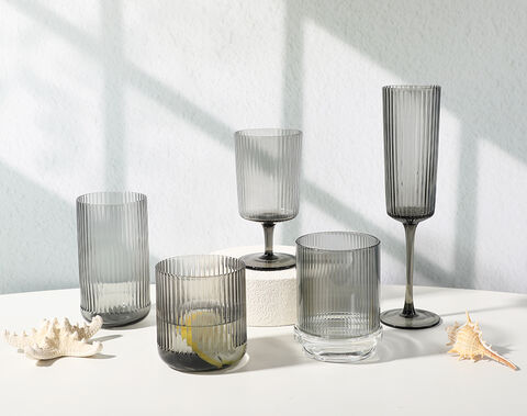 This unique grey color goblet is made of colored glass that takes on a unique striped line design which is very fashionable nowadays. Striped line design is also used in our other 10 types of products like tumblers, glass storage jars. dispensers, fruit bowls and plates etc.