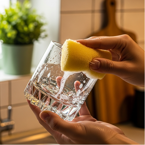 Use a clean sponge or microfiber cloth reserved only for glassware to avoid transferring grease or food particles. Never use abrasive scouring pads or steel wool.