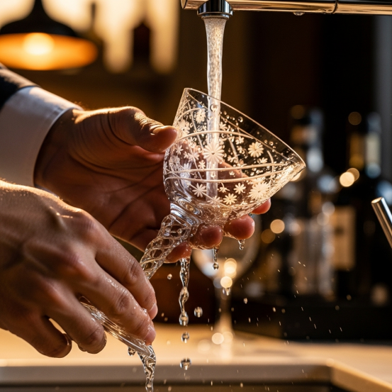 Hold the bowl of the glass firmly and carefully clean the rim (where lips touch) and the base, as these areas accumulate the most residue. For tall, narrow glasses, use a bottle brush with a soft tip.